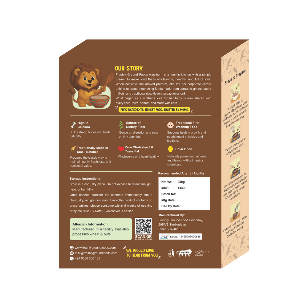 Add a nutritious twist to your daily routine with Freshly Ground Foods Finger Millet Milk Powder, and experience the wholesome goodness of nature with every sip or bite.
