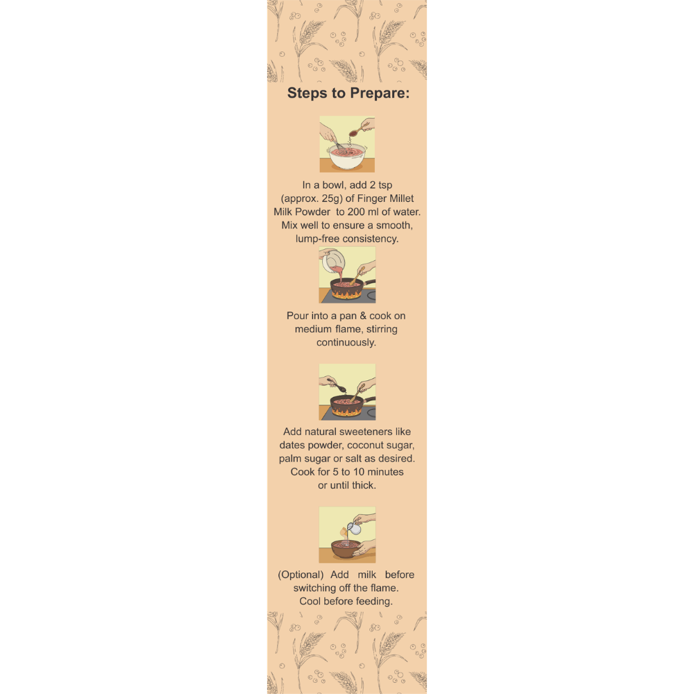 - Mix 2 tablespoons (25 - 30g roughly) of Finger Millet Milk Powder in 250 ml of water and mix it without any lumps.