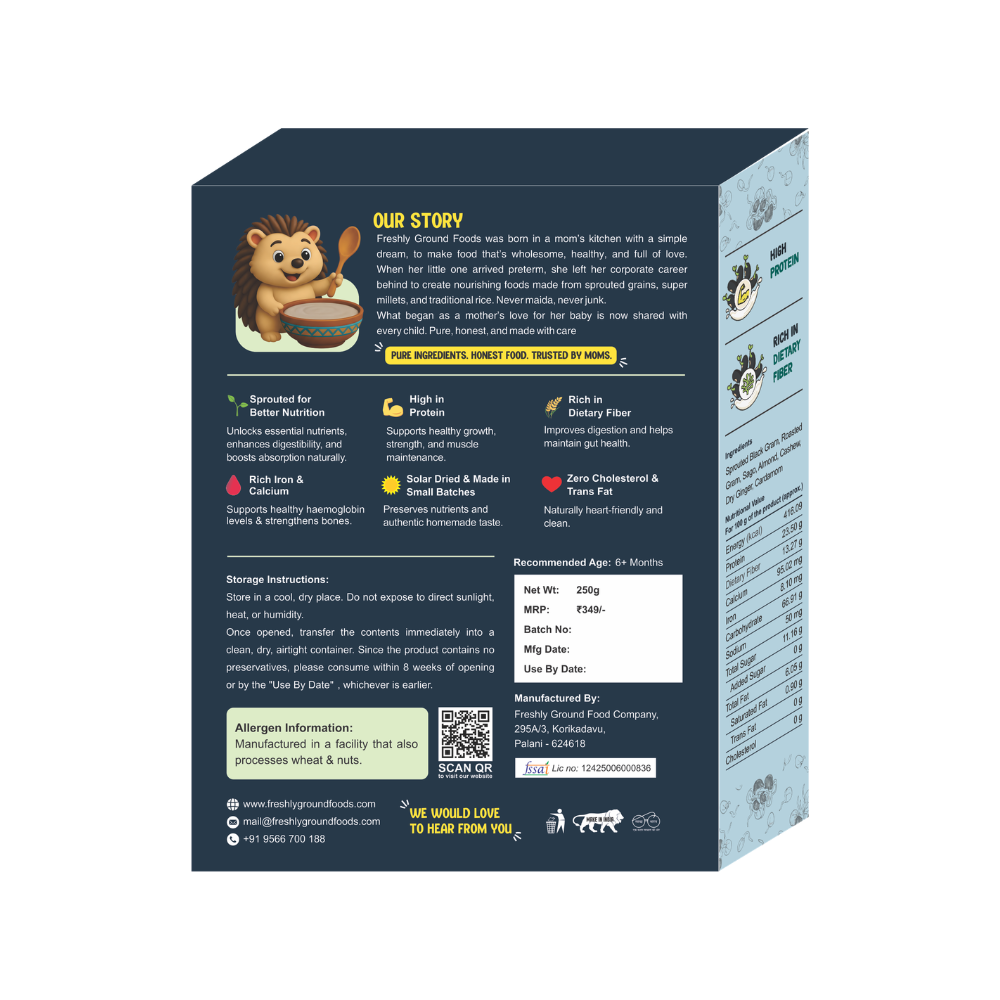 Freshly Ground Foods presents Sprouted Karupu Uluntham Kanji Mix / Sprouted Black Urad Dal Porridge Mix, a nutritious and flavorful option for starting your day on the right note. Our carefully crafted blend combines the goodness of sprouted black urad dal with wholesome grains and nuts, resulting in a hearty and satisfying porridge mix that nourishes both body and soul. Whether enjoyed as a warm breakfast option, a comforting snack, or a quick meal on-the-go, our Sprouted Karupu Uluntham Kanji Mix is a delicious and convenient choice for health-conscious individuals.