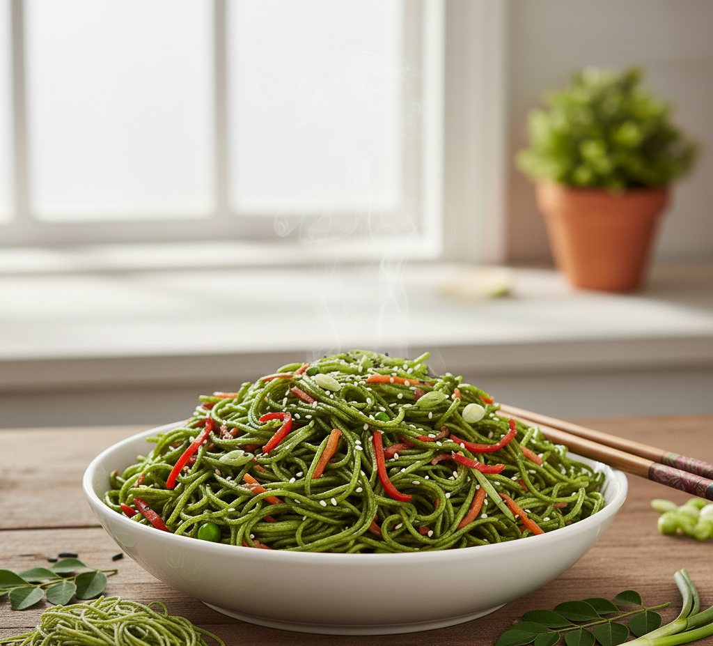 Moringa Noodles [192g] combine nutritious moringa leaf powder with quality wheat flour to deliver a healthy alternative to regular noodles. Rich in vitamins, minerals, and antioxidants, these noodles support immunity and overall well-being without compromising on taste or texture. Perfect for quick, wholesome meals, they cook easily and offer a subtle earthy flavor that complements a variety of sauces and seasonings. Ideal for health-conscious individuals seeking convenient nutrition in every bite.
