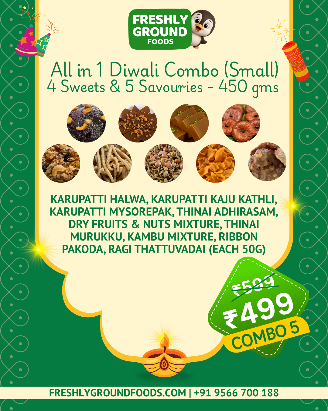COMBO 5 – ALL IN 1 DIWALI COMBO (SMALL) – 4 SWEETS & 5 SAVOURIES [50g EACH (450g)]